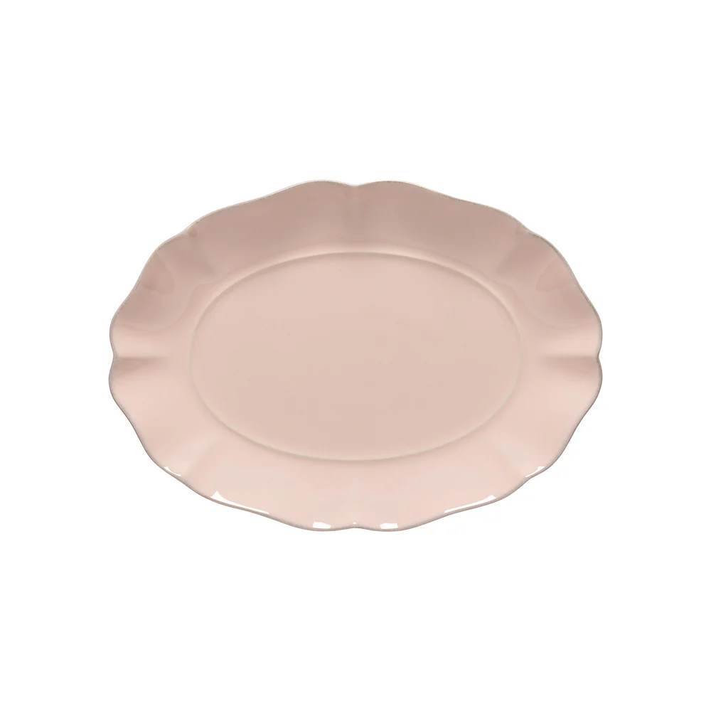 Portugalissa hienosta kivitavarasta valmistettu Rosa soikea tarjotin erottuu edukseen kiiltävällä lasitteellaan ja ainutlaatuisella viimeistelyllään. Sen leikatut yksityiskohdat ja muodot, joita korostaa herkkä käsinmaalattu reunus, luovat elegantin, modernin ja naisellisen kokoelman.