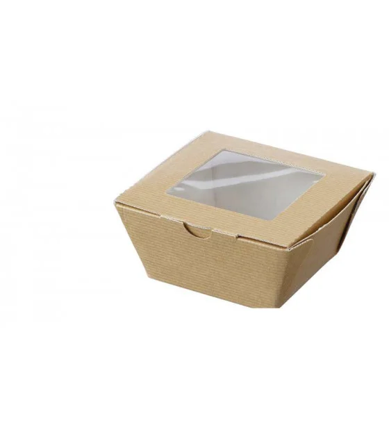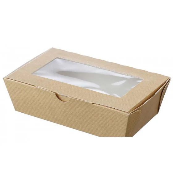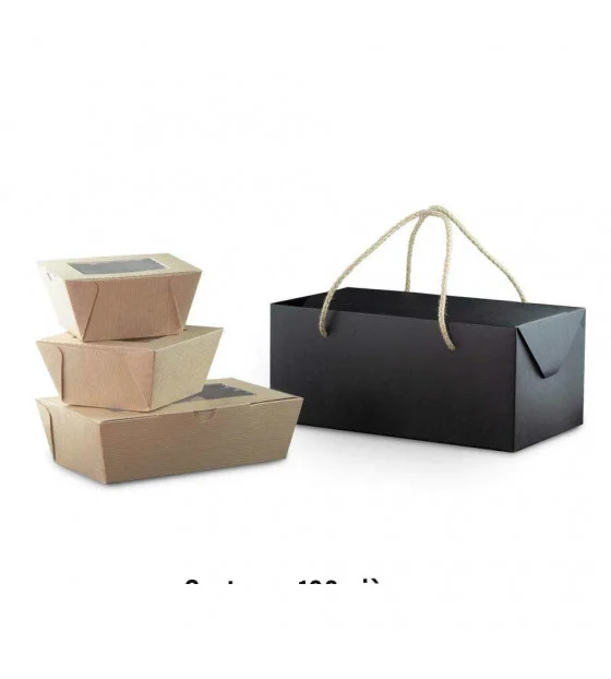 Yksilöllinen ateriapakkaus, mustassa Faubourg-pahvilaatikossa, joka koostuu 3 kraft-alustasta, saranoiduilla kansilla PET-ikkunalla.